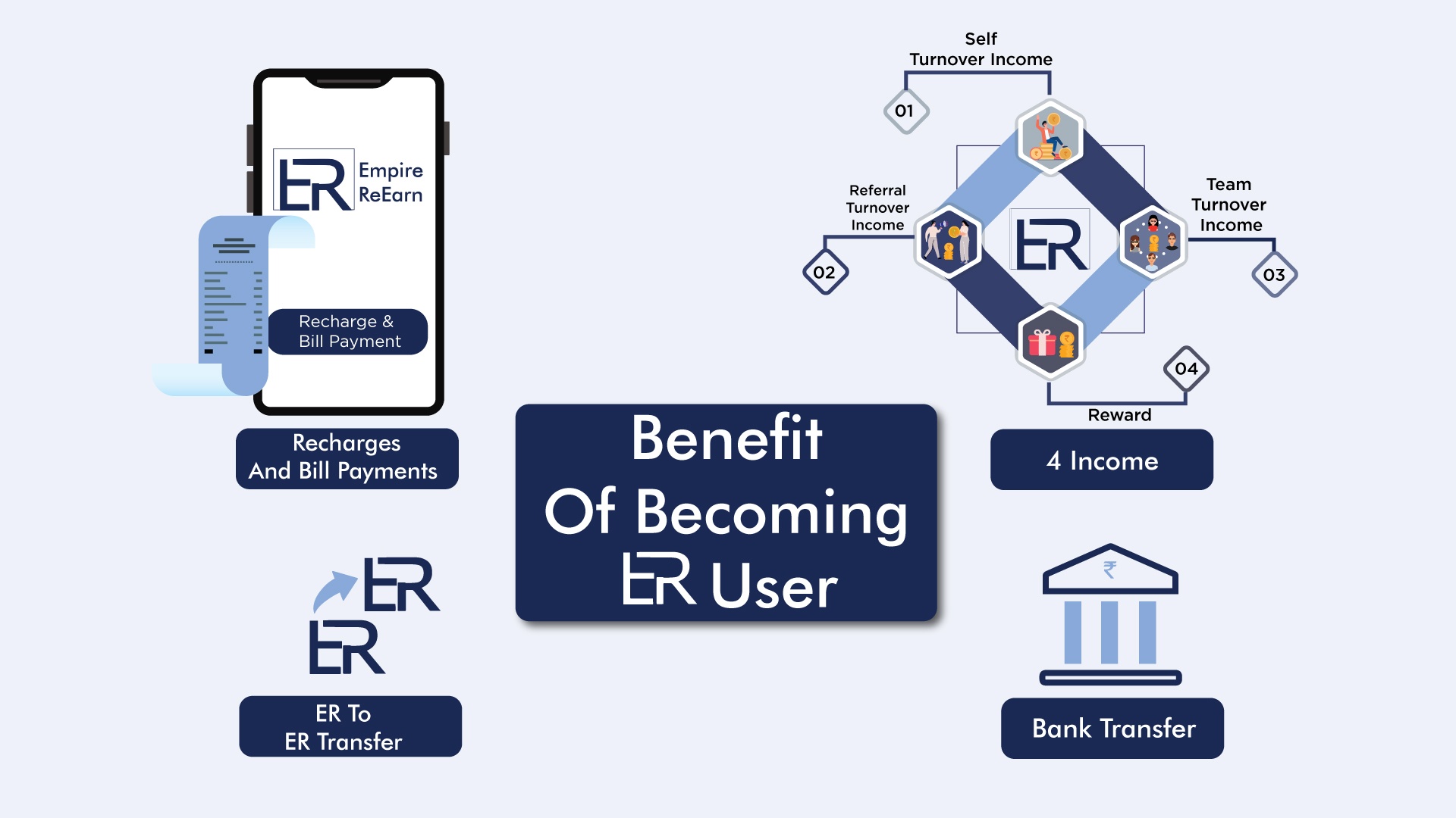ER user can begin to earn Self Turnover Income based on his self efforts, that is, when he does online mobile recharge and DTH recharge from his own profile at ER. User gains Referral Turnover Income on the turnover of ER user’s direct referred user (friends and family) online mobile recharge and online DTH recharge. Similarly, ER user can also make money from his Team Turnover Income on the total turnover of his referral users together with refer to referred users’ mobile and DTH recharge. ER user can get Reward from the company when the user has maintained the target level within the time frame decided by the company, plus, has completed the target of topup and recharge of mobile or DTH of minimum non-repeated members.